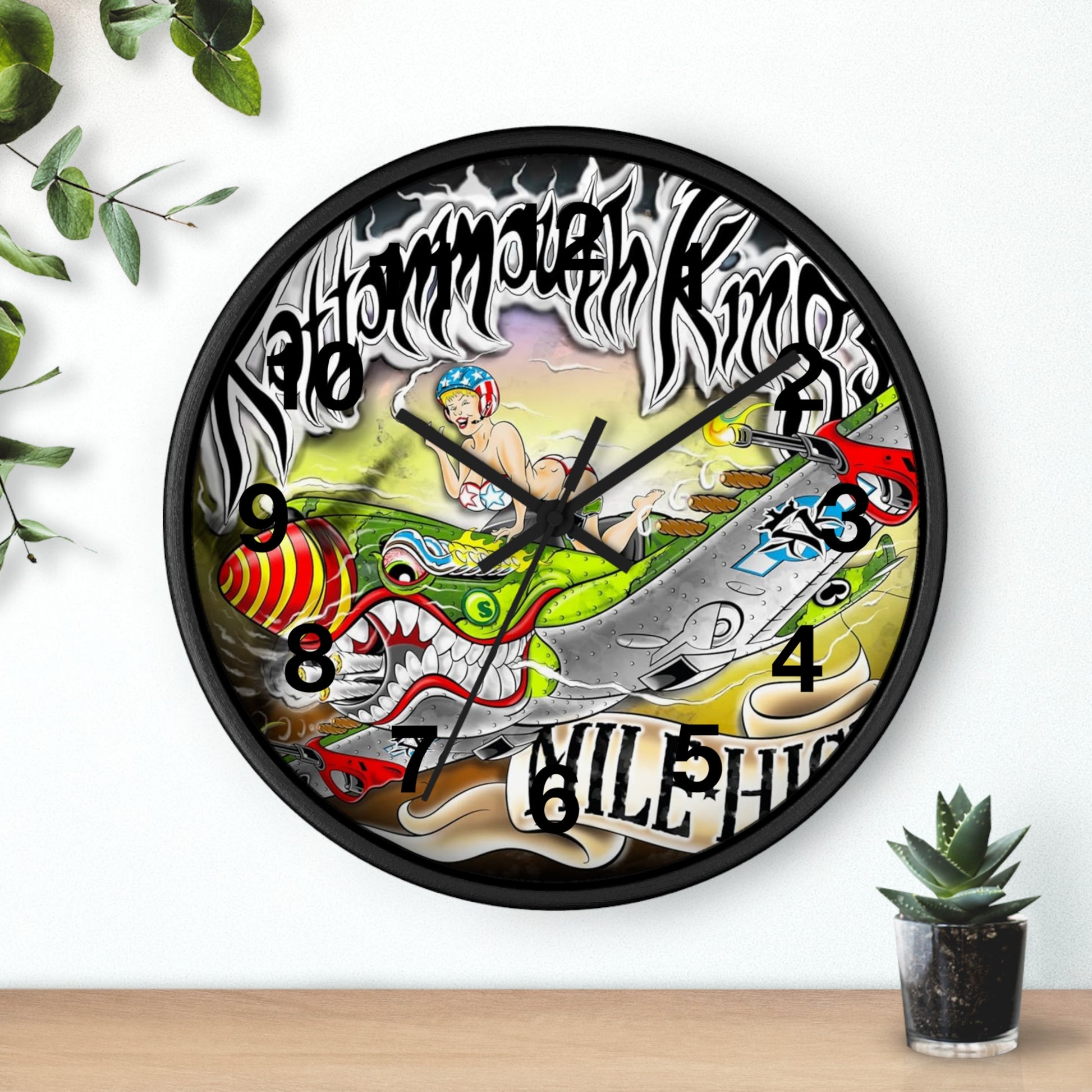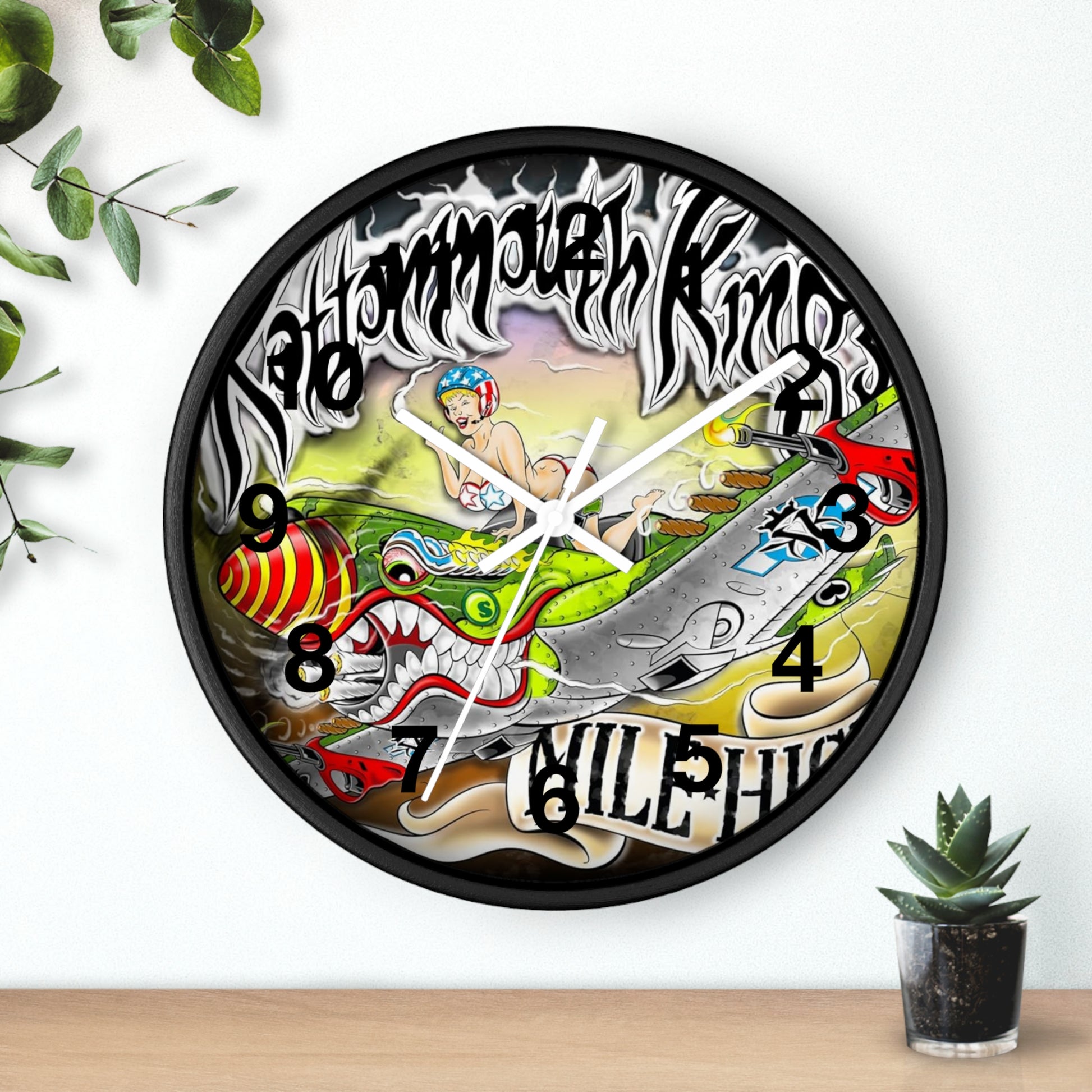 This 10" wall clock brings bold, skateboard-inspired art into any room that thrives on edge and movement. The vivid print—sharp colors on plexiglass—feels alive: a fearless rider, stylized creatures, and graffiti lettering swirl together into a high-energy scene. Choose a natural wood, black, or white frame with matching hands to make the artwork sing against your wall. The low-profile wooden frame and silent mechanism keep the focus on the art while the pre-installed hook makes it simple to hang where it will be seen and talked about. Runs on one AA battery (not included).