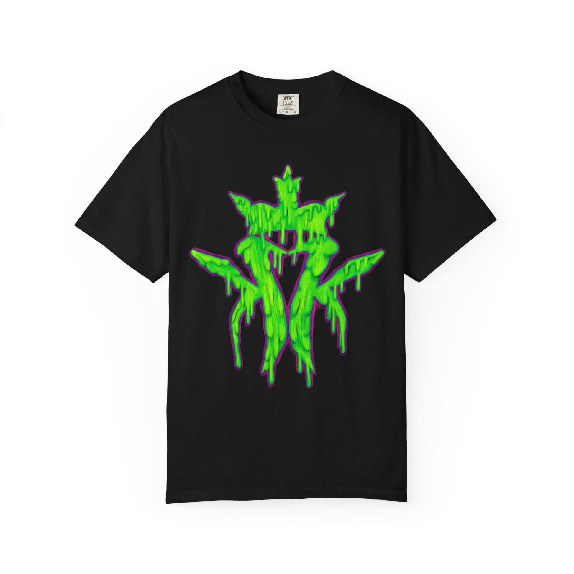 An oversized, garment-dyed tee that wears like a memory and carries an edge. The heavy 100% ring-spun cotton has a lived-in softness from post-construction dyeing, while the bold neon-green, drippy sigil graphic pops against deep black for a look that reads like night-park vandalism meets underground ritual. Cut with a relaxed silhouette and tubular knit (no side seams), this shirt hangs easy over hoodies or on its own for late-night shows, skate sessions, or city wandering. The double-needle stitching and pre-shrunk heavyweight fabric mean it holds shape through repeat wear. If you collect statement pieces with attitude, this tee slides straight into rotation.