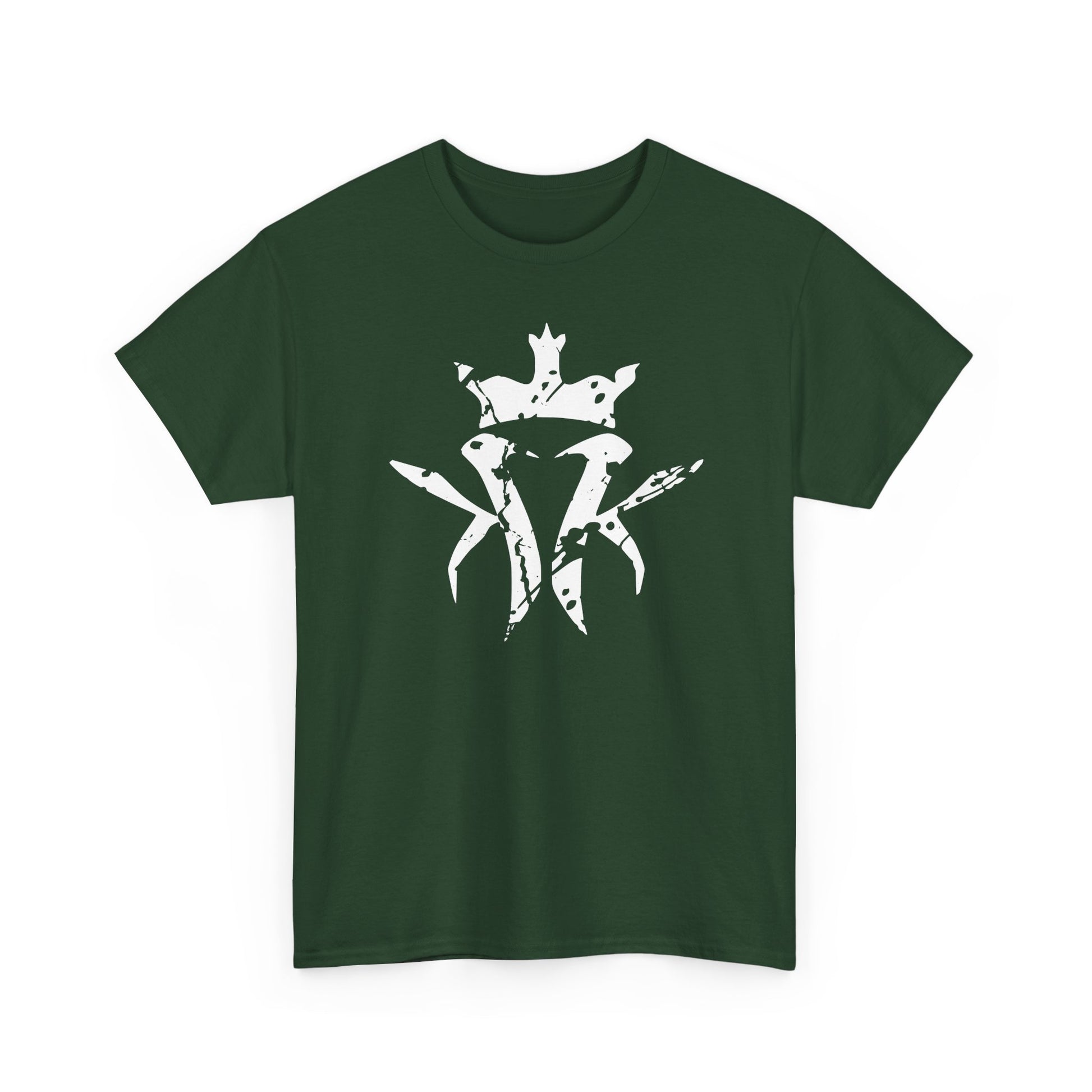 This heavyweight cotton tee carries a bold, nature‑etched design that feels both rugged and quietly rooted. The forest‑green fabric offsets the weathered white emblem — a stylized arrangement of leaves, branches and a subtle crown motif — giving the shirt a worn-in, outdoorsy spirit. It sits comfortably on the shoulders with a classic crew neckline and a relaxed cut that moves easily from trail mornings to late‑night fireside talks. The tactile, durable cotton holds print detail sharply while aging gracefully, so the shirt becomes part of your regular rotation instead of disappearing into a drawer.
