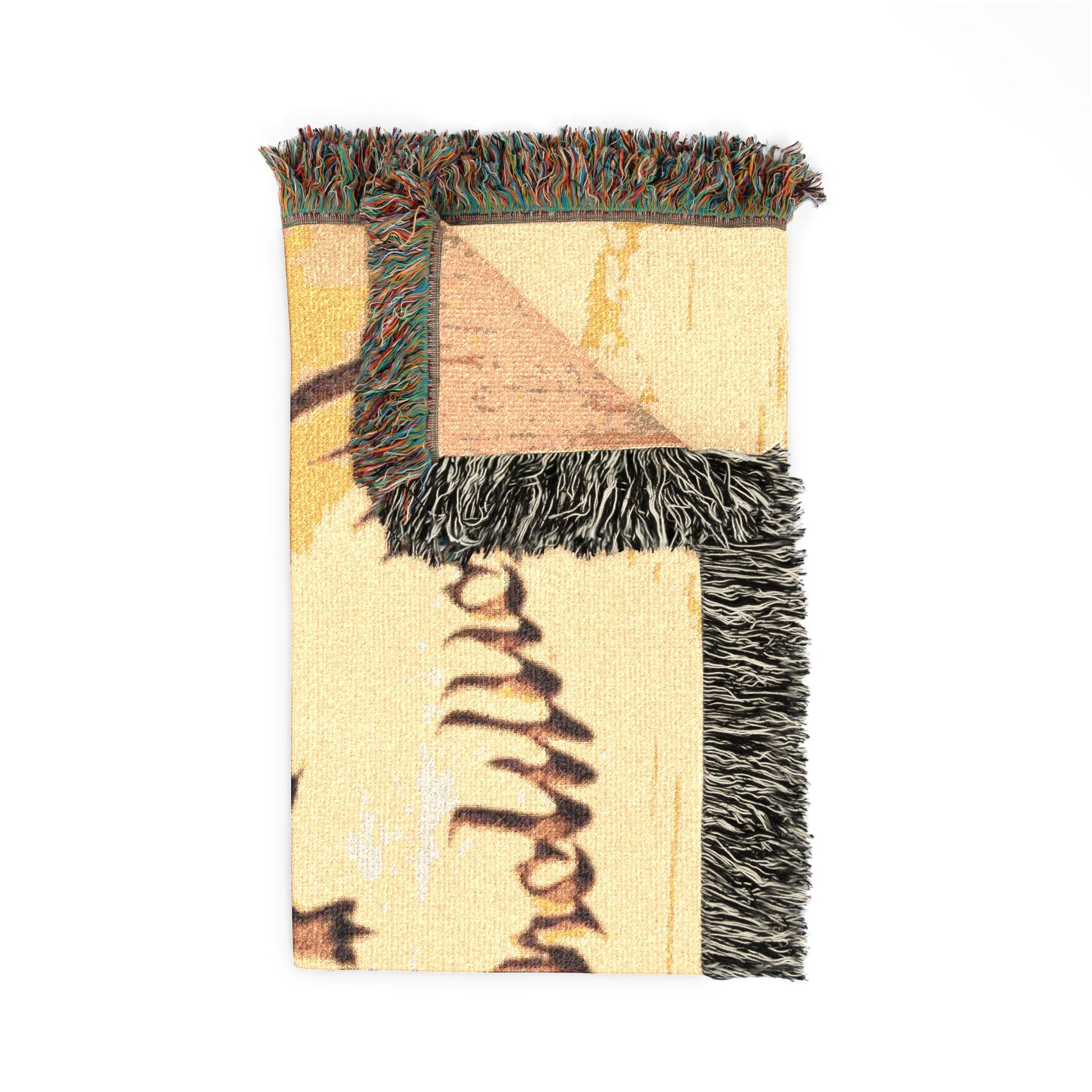 This woven blanket brings a lived-in, music-loving vibe to couches, tour vans, and late-night rooftop hangs. The design reads like a band emblem — rough-hewn lettering below a stylized crown-and-leaf motif — worked into the weave so the imagery feels integrated, not slapped on. Soft 100% cotton threads and colorful fringe give it warmth and texture while the woven technique keeps the graphic muted and tactile. Choose the Photo variant to preserve subtle shading in photographic elements, or the Artwork variant to keep strong, separated color blocks crisp. Available in three sizes, it drapes easily over shoulders, folds into a gig bag, or layers across living-room seating for an instant statement that’s equal parts grit and comfort.